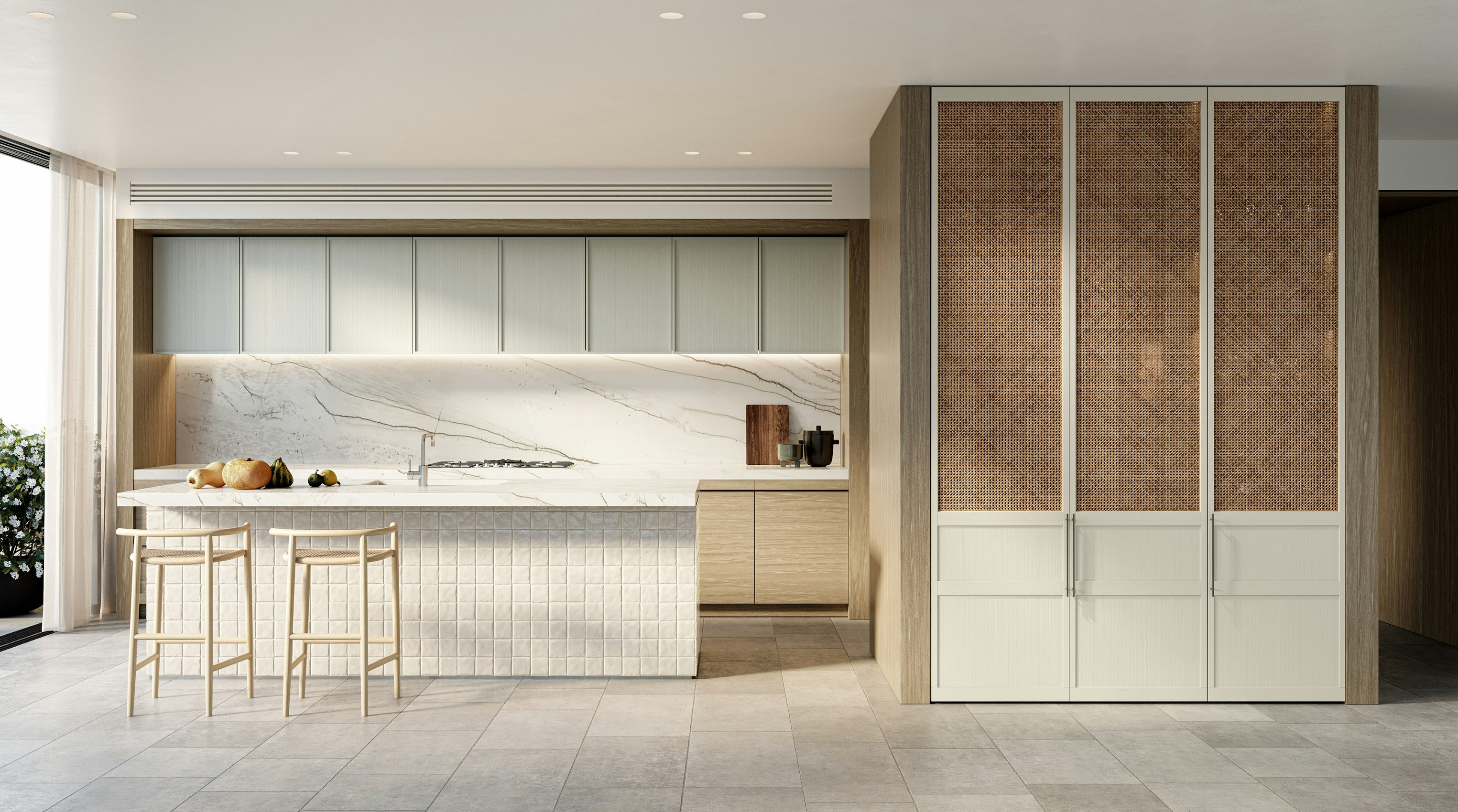 Premier Place residences are distinctive, and unambiguously beautiful. Wide hallways draw you from the timber-lined entrance and create a sense of transition. From the world beyond, cross the threshold into a home as a place of sanctuary. Every material is considered for its classic aesthetic, texture and form. One palette features cool greys, subtle teal accents and stunning natural granite surfaces. The other, a warm, textural scheme with bespoke crafted woven rattan and beautifully veined stone.